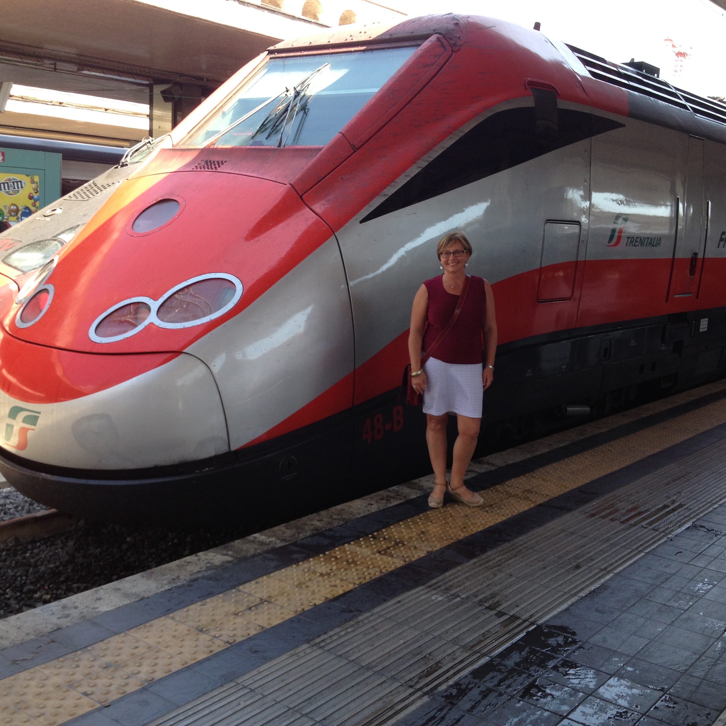 This was the way to see the Italian landscape – mountains looming on either side, with little villages cropping up in the oddest of locations. Churches on hill tops give way to buildings and houses cascading down the sides as if they had volcanically erupted from the hill itself. These lead into to gorgeous seascapes with sail boats and gentle waves in the most beautiful shades of blue imaginable. In and out of tunnels, the scenery constantly changed. Farmland and vineyards as far as you could see. Picturesque Italy- seen at 297 kilometers per hour.
