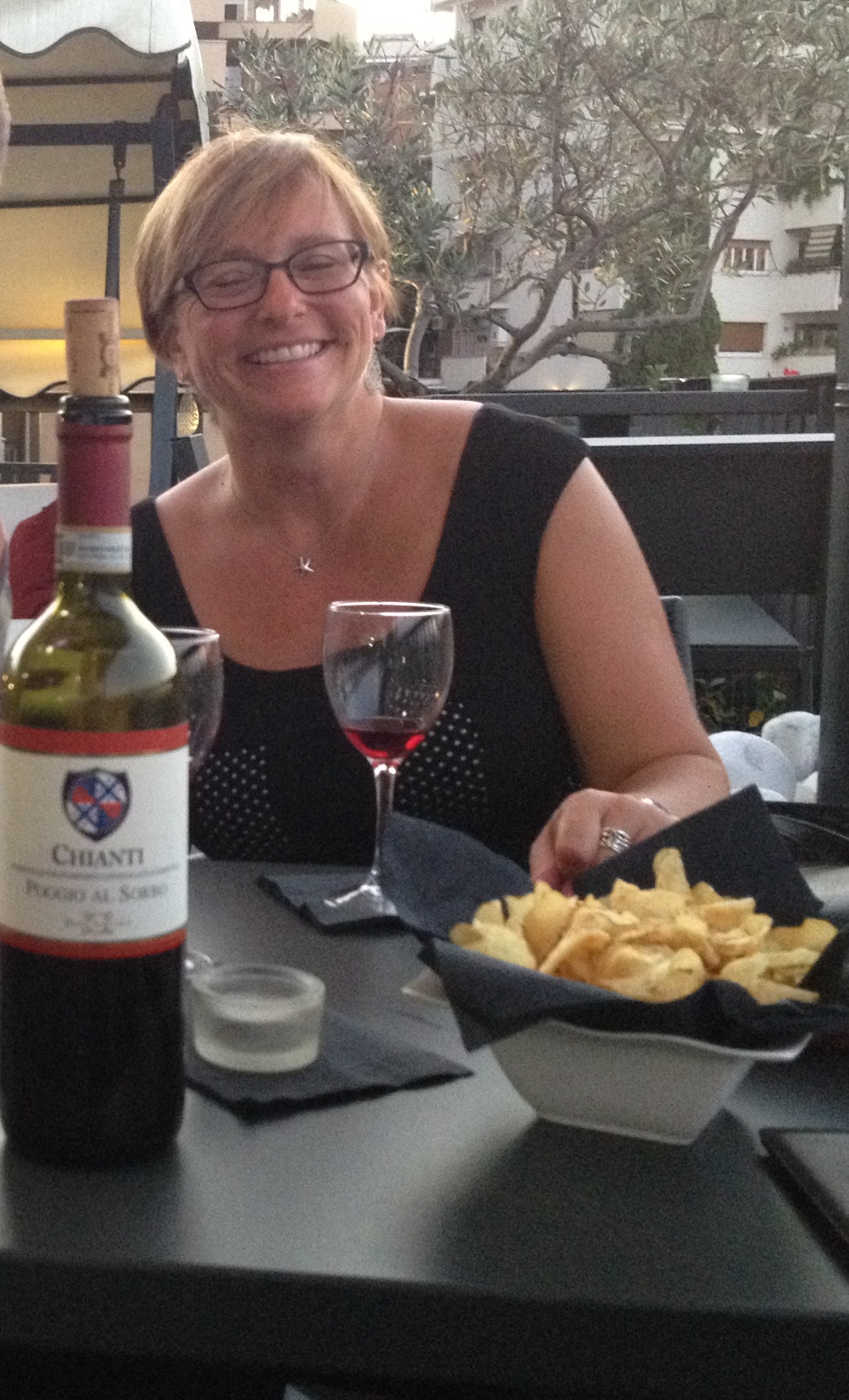 Picture this – the barman opens and pours our wine (with flourish ). He leaves for a few minutes, only to return with chips in a bowl lined with a paper serviette. The barman moves to light a candle in the gathering twilight. To assist him, we adjust the position of the snack bowl. Voila! – We light the serviette on fire! Watching the flames circle the bowl, we ineffectively try to blow out the flames. The barman laughs, grabs the flaming bowl (with flouish) and within 30 seconds replaces it with another, much fuller bowl. He strategically places it away from the open flame this time.